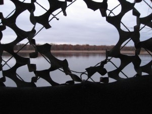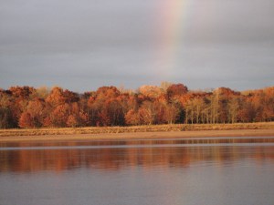 Instead, we got a rainbow.  Protected from the wind by the fabric of the blind, I wasn’t cold or the least uncomfortable, though we stood there for two hours.  With the streaks of the partial rainbow over the east bank of the river and the first hints of sunset behind us, it was a good place to be on an October day, whether we saw birds or not.